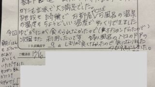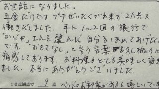 お世話になりました。年金だけではプチぜいたくが出来ず2人共又働きだしました。年に1,2回の旅行で 「かどや」さんを選んだ自分をほめてあげたいです。「おもてなし」と言う言葉を久し振りに痛感しております。お料理もとても美味しく頂き本当にありがとうございました。ベッドのお部屋があると嬉しいです。(兵庫県S様 ご夫婦旅行)