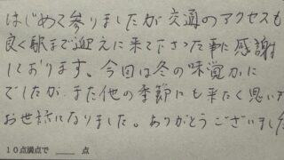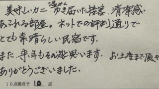 美味いカニ、温かくゆき届いた接客、清潔感あふれる部屋。ネットでの評判通りでとても素晴らしい民宿です。また、来年もその次もと思います。お土産まで頂きありがとうございました。(奈良県Y様 ご夫婦旅行)