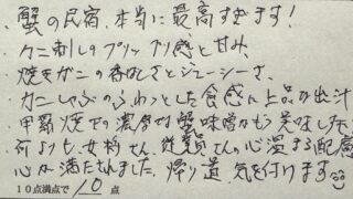 蟹の民宿、本当に最高すぎます!カニ刺しのプリップリ感と甘み、焼きがこの香ばしさとジューシーさ、カニしゃぶのふわっとした食感に上品な出汁、甲羅焼での濃厚な蟹味噌かもう美味しすぎる。何よりも、女将さん、従業員さんの心温まる配慮心は満たされました、帰り道、気を付けます。