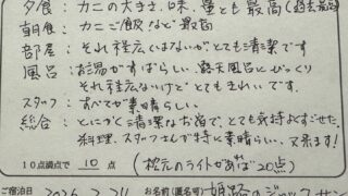 夕食:カニの大きさ、味、量とも最高(過去最高)朝食:カニご飯など最高。部屋:それ程広くはないが、とても清潔です。風呂:お湯がすばらしい、露天風呂にびっくり。それ程広ないけどとてもきれいです。スタッフ:すべてが素晴らしい。総合:とにかく清潔なお宿で、とても気持よくおごせた。 料理、スタッフさんが特に素晴らしい、又来ます