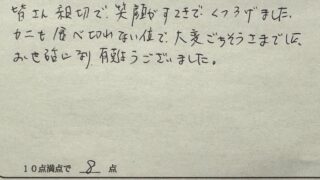 カップル・ご夫婦旅行 皆さん親切で、笑顔がすてきで、くつろげました いい旅P ご夫婦旅行 皆さん親切で、笑顔がすてきで、くつろげました。 カニも食べ切れない位で、大変ごちそうさまでした、 お世話になり、有難うございました。(大阪府K様 ご夫婦旅行 2026.3.9. ぷりっぷり食感☆活柴山かにの刺身付!“いい旅プラン 基本P”<香住>) 2026.03.10 カップル・ご夫婦旅行