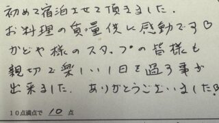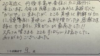 20年近く、丹後半島や香住にカニ旅行に来ています。今年は民宿に泊ってみようと家族10人で 「かどや」に来ましたが、どこも美味しく新鮮なカニに、全員「本当に美味いお料理だった」と感激です。 特にカニ刺し、焼ガニが最高でした!!スタッフの皆さまもとてもすばらい対応でした。 ありがとうございました。