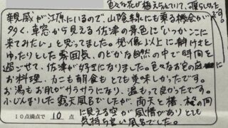 2度目の宿泊です。前回もスタッフの方が、とても親切で、気持ち良く過ごさせて頂きました。露天が気に入り、3度も入ってしまいました。また機会がありましたら、泊まりたいですね。ありがとうございました。久しぶりに訪れ、何も変わらない素朴な町、ゆっくり時間が流れ気持ちが落ち着く感じがとても良い。これが一番です。