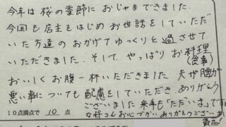 今年は桜の季節におじゃまできました。今回も店主をはじめお世話をしていただいた方達のおかげで、ゆっくりと過させていただきました。そして、やっぱりお料理 (食事) おいしくお腹一杯いただきました。夫が腰が悪い事についても配慮をしていただき、ありがとうございました。