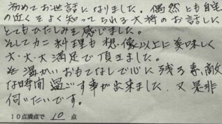 初めてお世話になりました。偶然にも自宅の近くをよく知ってられる大将のお話しにとてもひたしみを感じました。そしてカニ料理も想像以上に美味しく大・大・大満足で頂きました。温かいおもてなしで心に残る素敵な時間過ごす事が出来ました、又是非伺いたいです。(大阪府H様 大人の親子旅)
