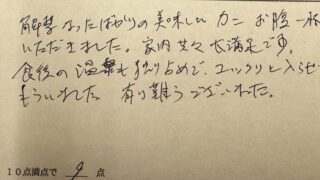 解禁なったばかりの美味しいカニお腹一杯いただきました。家内共々大満足です。 食後の温泉も独り占めで、ユックリと入らせてもらいました。有り難うございました。(兵庫県K様 ご夫婦旅行 2025.11.10. ぷりっぷり食感☆活柴山かにの刺身付!“いい旅プラン 基本P”<香住>)